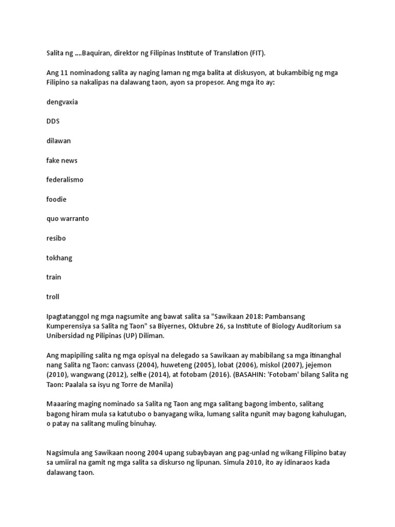 One out of 11 words most of which made their way to the headlines this year will be hailed as the Salita ng Taon or the Filipino word of the year 2018. CrdtsAquino CarissaArcanghel JoannaDe Guzman WendyDizon Rejealieryne Macalanda Geri. At the Institute of Biology Auditorium UP Diliman UPD.