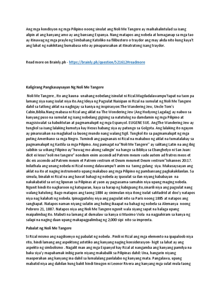 Ang Pagsulat ng Noli Isinulat niya ang huling kabanata sa Wilhemsfield noong Abril- Hunyo 1886 Pebrero 1886- ginawa ang huling rebisyon Nasabi niya ang mga pangyayari kay. Identify parallel events in noli me tangere and el filibusterismo that are still relevant to the situation of the philippines right now. Sinimulang sulatin ni Dr.