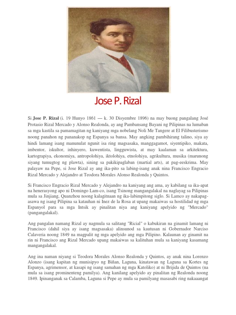 José Protacio Rizal Mercado y Alonzo Realonda 19 Hunyo 1861 30 Disyembre 1896 ay isang Pilipinong bayani at isa sa pinakatanyag na tagapagtaguyod ng pagbabago sa Pilipinas noong panahon ng pananakop. Del Pilar at Graciano Lopez Jaina. Unang tula na isinulat ni Rizal sa Ateneo Inialay niya sa ina noong kaarawan ng ina na nakalaya na mula sa pagkakabilanggo.
